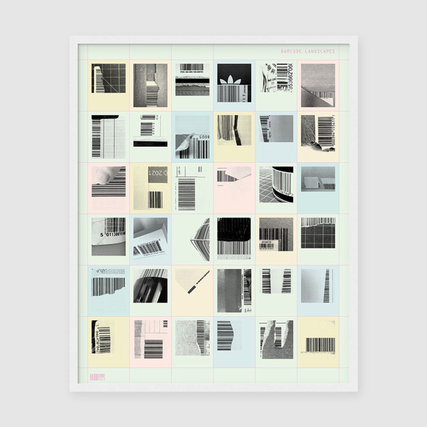 Barcode Landscape 003 – Thirty-six barcode compositions, all taken from discarded packaging, which ultimately inform the individual pieces.