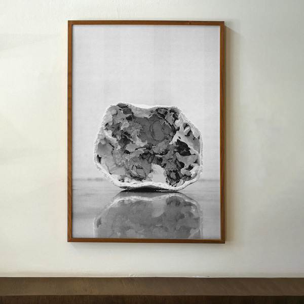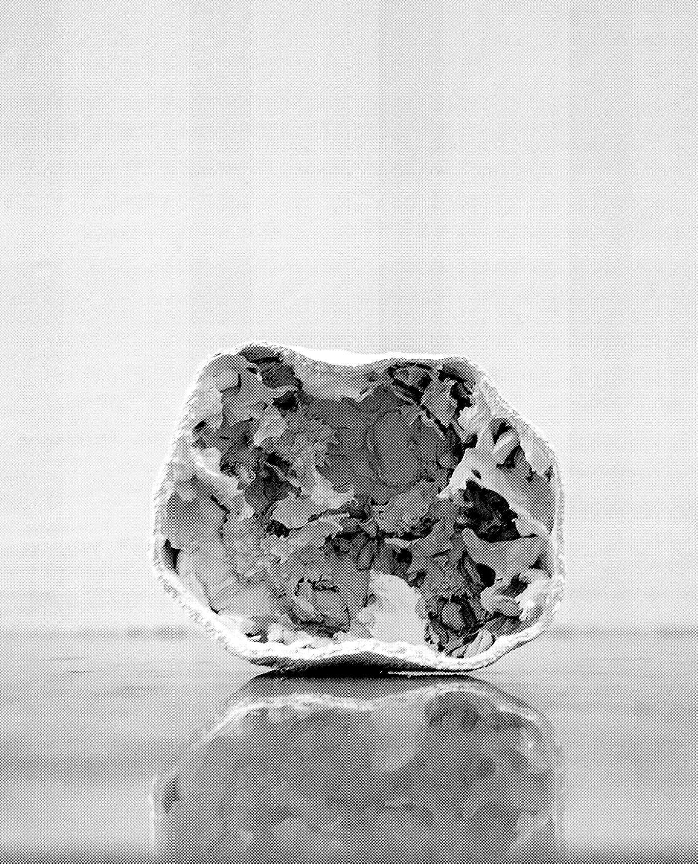 Pomegranate Ghost – This piece is inspired by the incredible paper sculptures of Pao Hui Kao. I wanted to recreate something similar and let the process influence the final outcome. The process involves experimenting with pomegranate fruit. The initial fruit, cross-section, deseeded, dehydrated at 52°c for fourteen hours, spray-painted white and photographed.